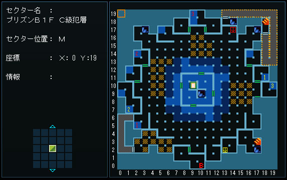 B2Fのベルを押したら、『B2F、X:3 Y:17』から再びB1Fに戻ります。