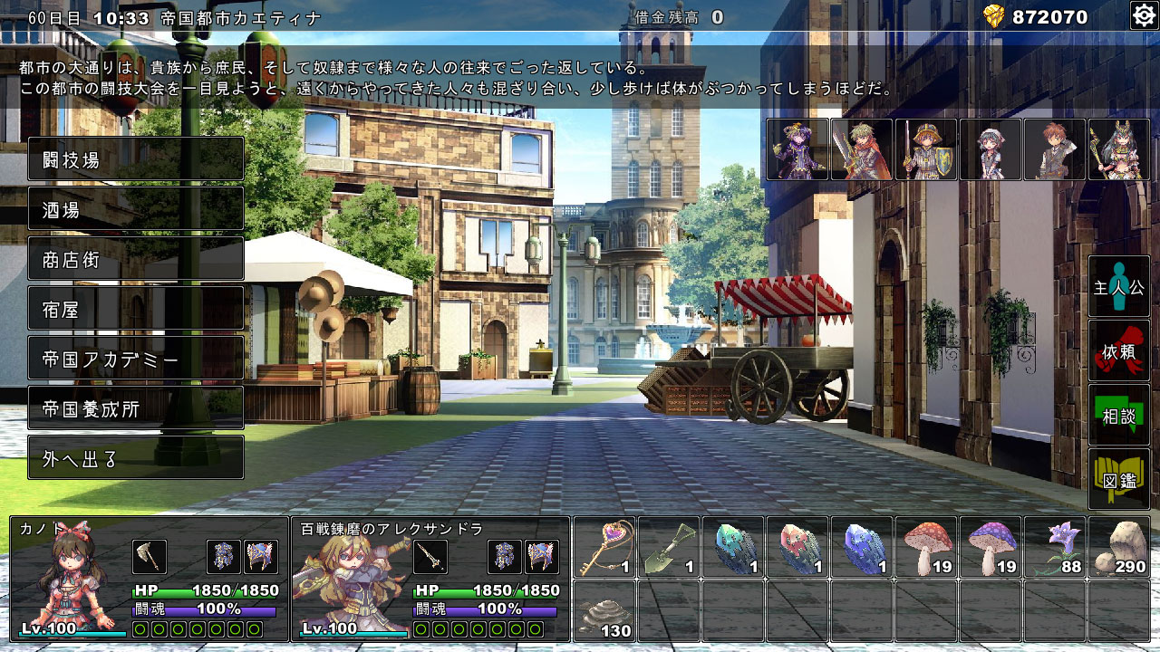 闘技場の各種大会で1位を取るだけで借金の大半が返せます。