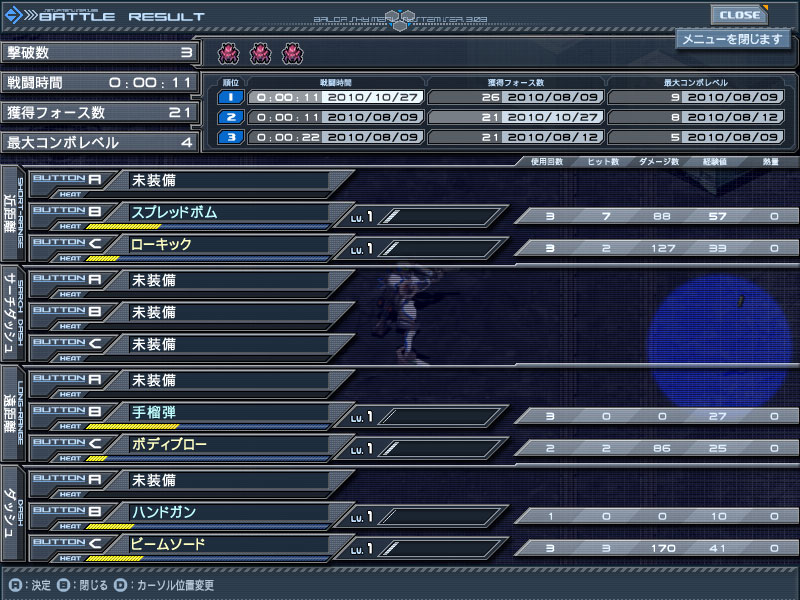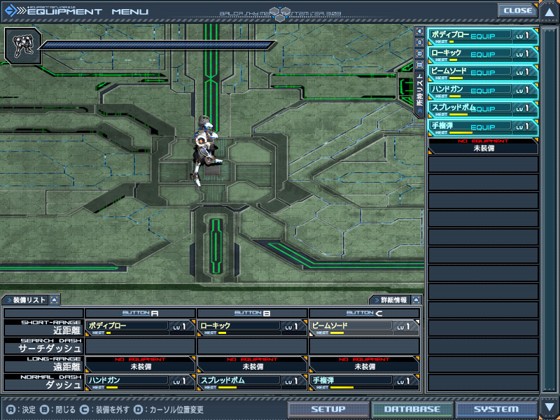 さて、武装の装備と、その点検(練習と称して、コンボの練習がセットアップでできます)